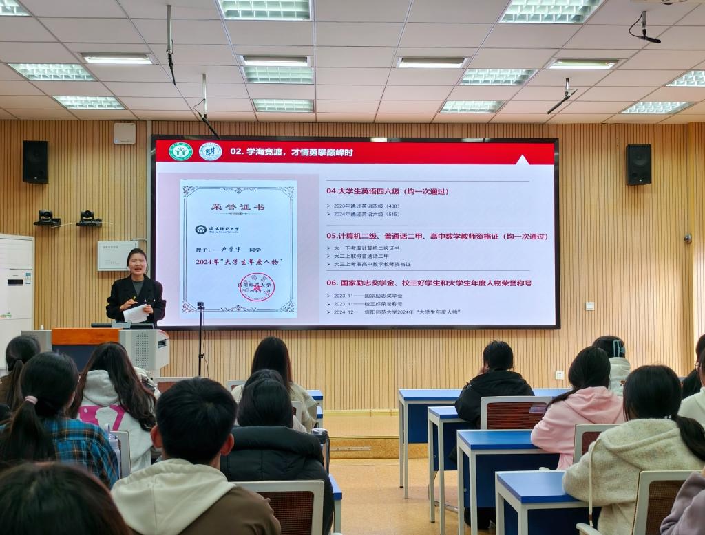 李璞同学以“自强不息行则止,磨砺始得璞玉成”为主题,围绕“思想认识、学术科研、团学工作、社会实践”四个方面,分享了自己如何科学规划大学时间,确保学习、工作、生活的平衡发展。他鼓励同学们在学习和实践过程中,不断探索创新,勇于“试错”,在奋斗中书写精彩人生。