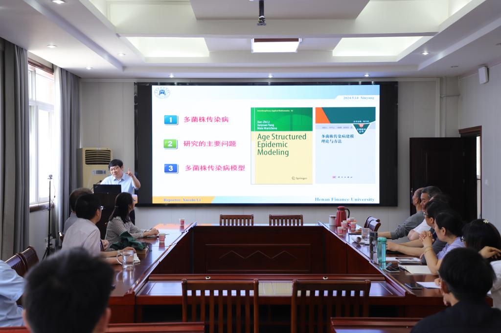 5月14日上午,应太阳成集团tyc234cc主页邀请,河南财政金融公司李学志教授在数学楼315会议室为公司师生做了题为“多菌株传染病动力学建模与研究”的学术报告,报告会由太阳成集团tyc234cc主页王霞教授主持,经理蔡礼明教授、副经理韩英波教授及部分教师和研究生聆听了报告。