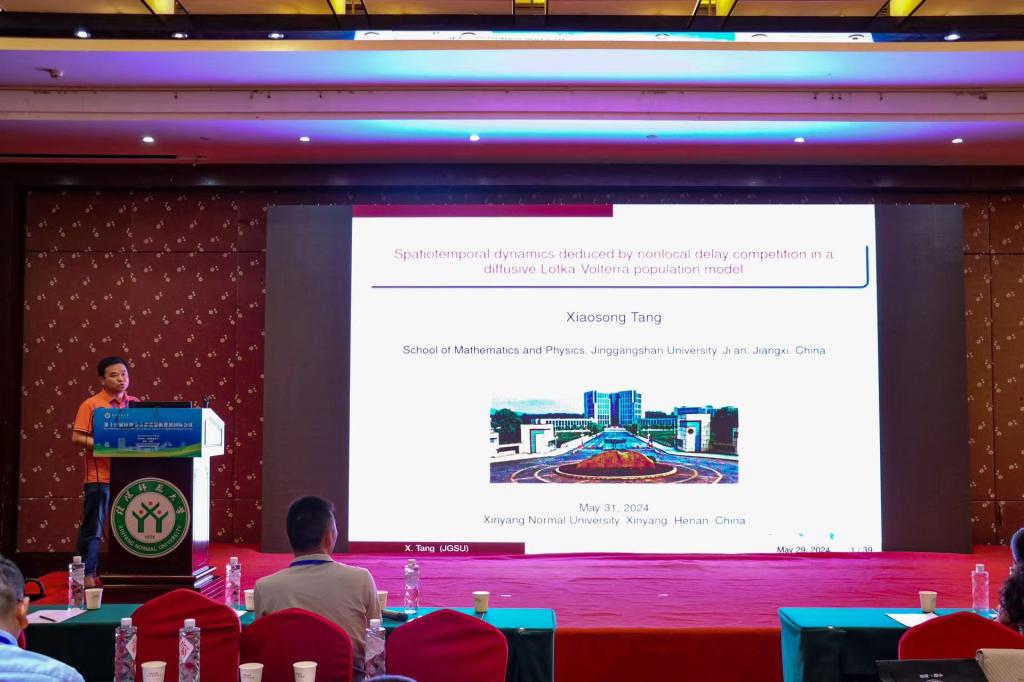 井冈山大学的汤小松,做了题目为《Spatiotemporal dynamics deduced by nonlocal delay competition in a diffusive Lotka-Volterra population model》的报告。