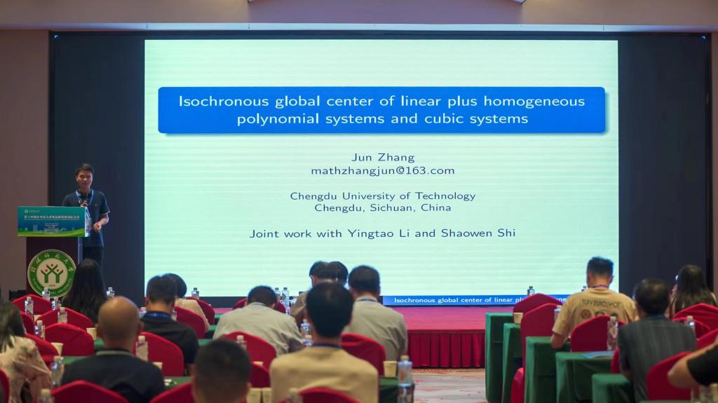 成都理工大学的张军,做了题目为《Isochronous global center of linear plus homogeneous polynomial systems and cubic systems》的报告。