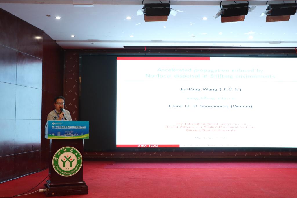 中国地质大学(武汉)的王佳兵,做了题目为《Finite or infinite spreading speed of nonlocal dispersal Fisher-KPP equations in shifting habitats》的报告。