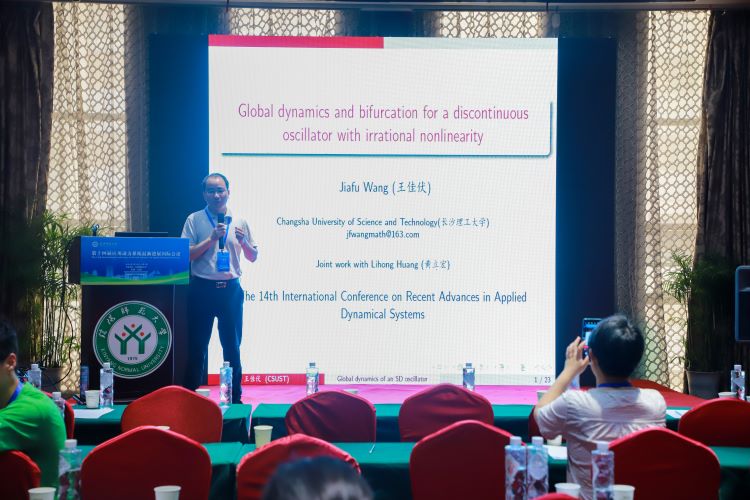 长沙理工大学的王佳伏,做了题目为《Global dynamics and bifurcation for a discontinuous oscillator with irrational nonlinearity》的报告。