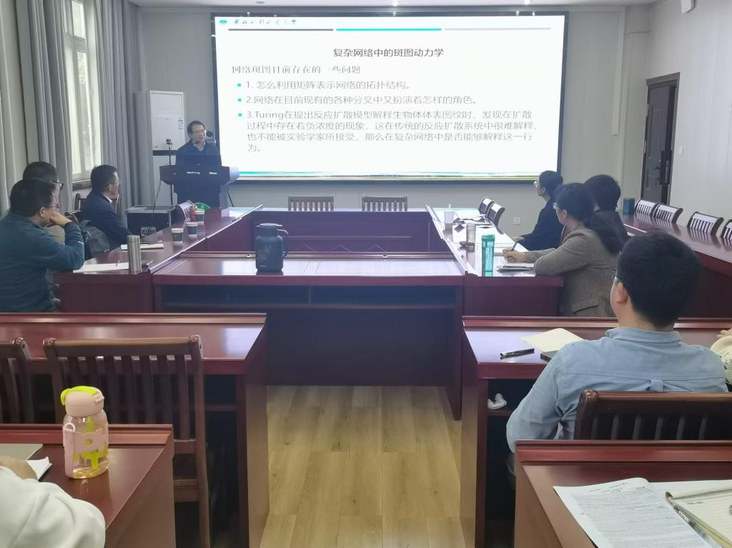 报告中,申教授首先回顾了反扩散系统斑图动力学发展的历史,阐述了非线性系统分岔间转换关系及其同具有生理现象的斑图间的关系。随后,申教授介绍了反应扩散网络中图灵不稳定的存在性及其生理机制,以及网络中图灵不稳定性和负波数产生的条件。 最后,申教授介绍了其团队在非光滑性反应扩散系统中引起图灵失稳机制的最新进展以及各种斑图对应的生物学意义。