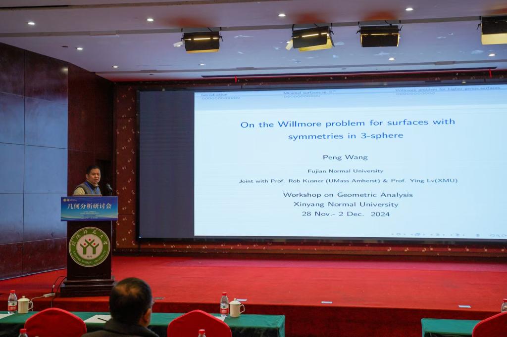 11月29日下午共有4场学术报告,第1场学术报告是由福建师范大学的王鹏教授作了题目为“On the Willmore problem for surfaces with symmetries in 3-sphere”的学术报告,此场学术报告由上海交通大学的杨义虎教授主持。