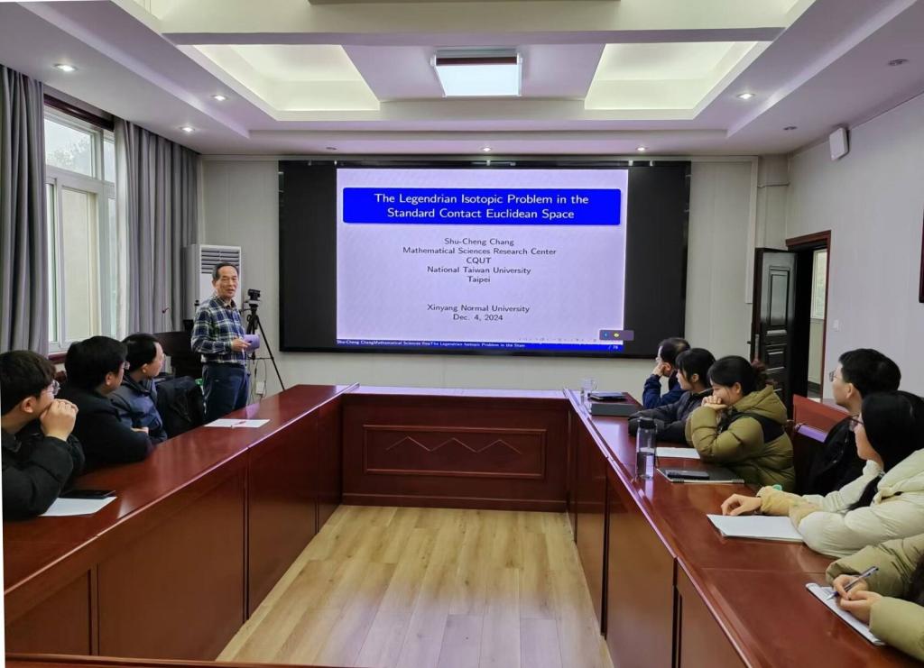 12月4日上午,应太阳成集团tyc234cc主页邀请,台湾大学/重庆理工大学张树城教授作了题为《The Legendrian Isotopic Problem in the Standard Contact Euclidean Space》的学术报告。报告会由韩英波教授主持,部分教师及研究生聆听了此次报告。