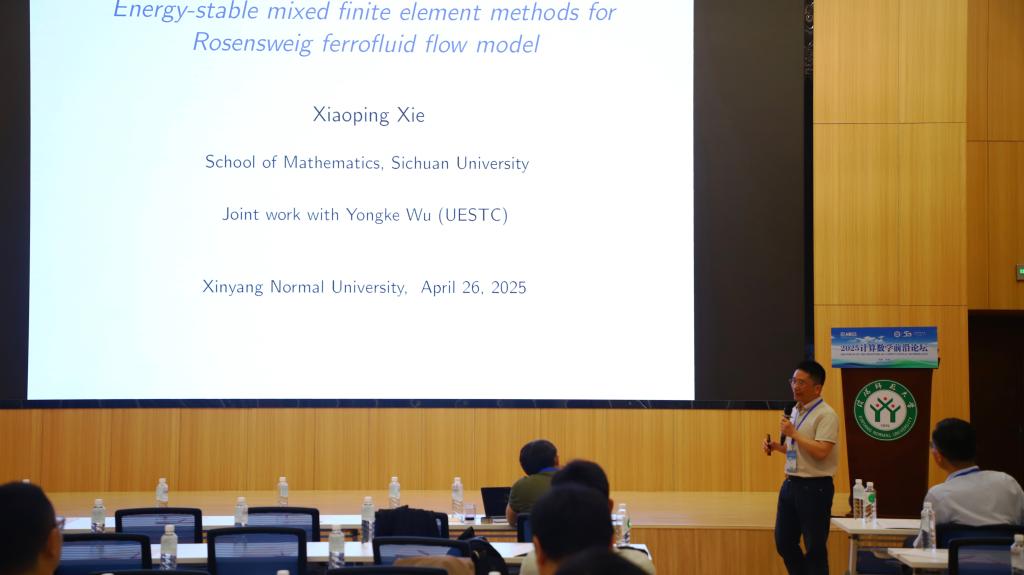 3四川大学谢小平教授作了题目为《Energy-stable mixed finite element methods for the Rosensweig ferrofluid flow model的学术报告