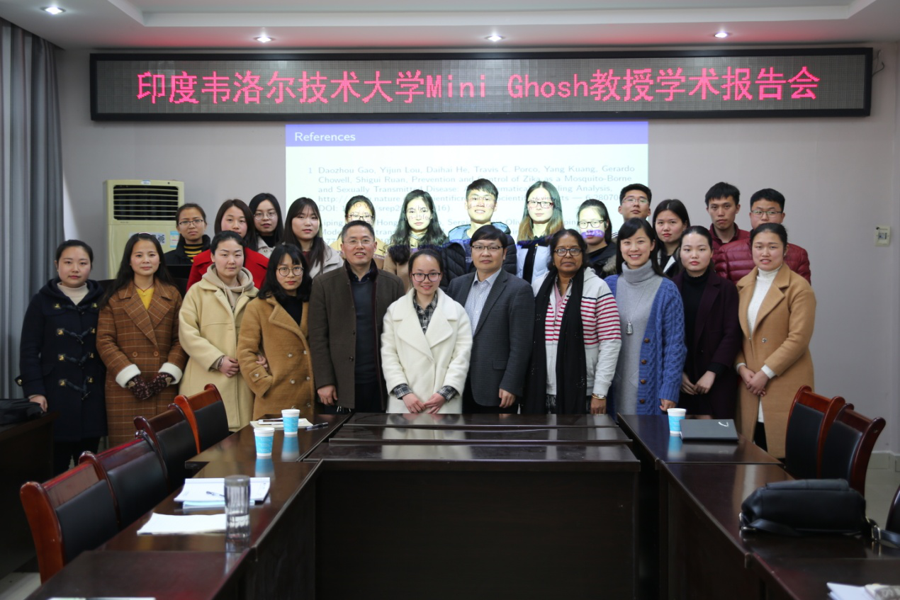 2018年3月10日下午,应太阳成集团tyc234cc主页邀请,印度韦洛尔技术大学(Vellore Institute of Technology)数学系教授Mini Ghosh来公司讲学和开展合作研究, 并在数学与统计公司学术报告厅作了题为“Mathematical Modelling of Zika Virus Disease”的学术报告。报告会由太阳成集团tyc234cc主页副经理蔡礼明教授主持,河南师范大学副董事长李学志教授和该院部分教师及研究生聆听了此次报告。