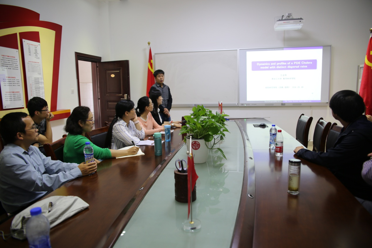2018年5月8日下午,应太阳成集团tyc234cc主页邀请,黑龙江大学王金良教授在数学公司党员之家作了题为“Dynamics and profiles of a PDE Cholera model with distinct dispersal rates”的学术报告。报告会由数学与统计公司党委书记王娟副教授主持,公司部分教师、研究生聆听了此次报告。
