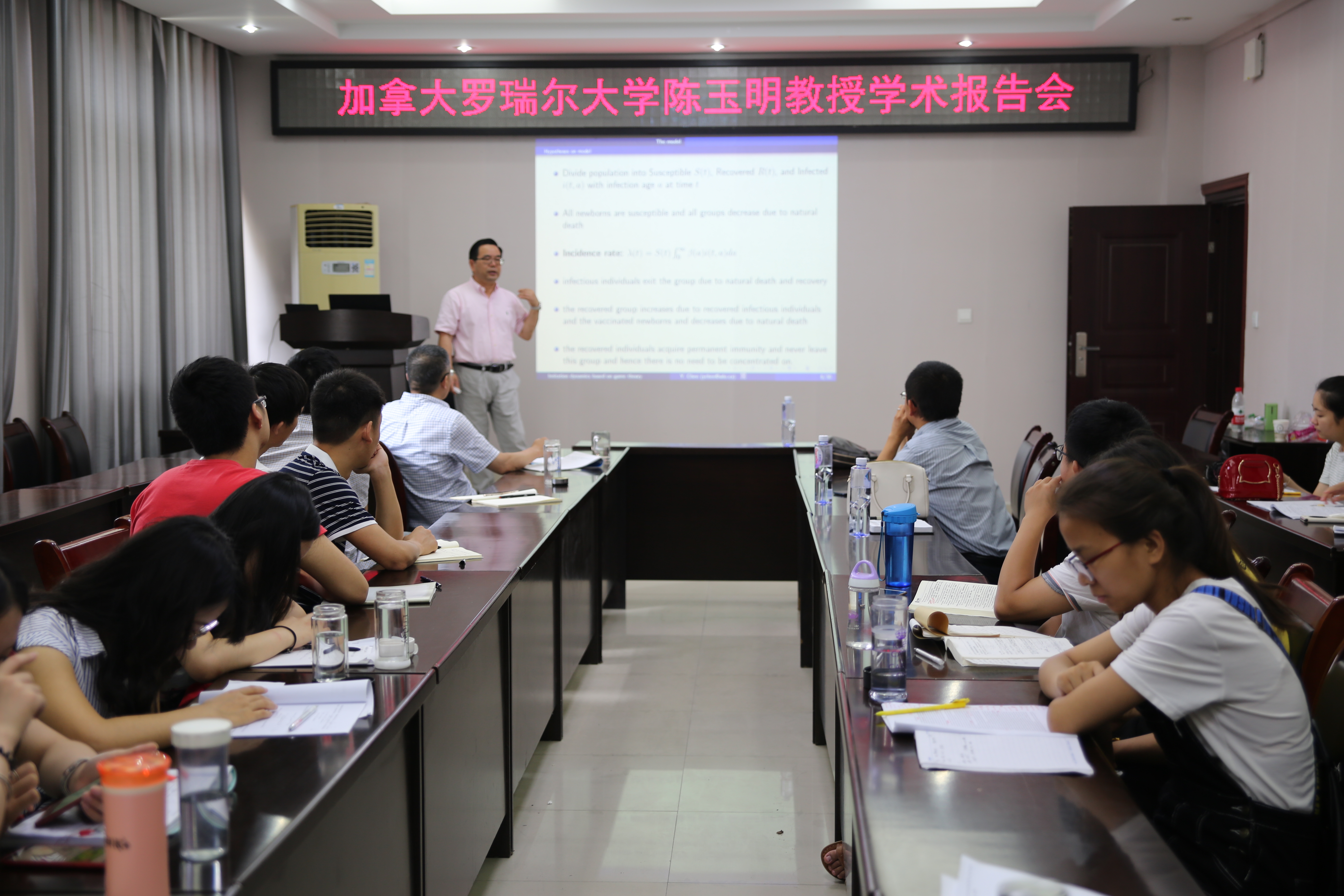 6月21日,应太阳成集团tyc234cc主页邀请,加拿大罗瑞尔大学陈玉明教授在太阳成集团tyc234cc主页学术报告厅分别作了题为“Global analysis of a viral model with both cell-free and cell-to-cell infection modes”和“Imitation dynamics of vaccine decision-making behaviors based on the game theory”的学术报告。报告会由太阳成集团tyc234cc主页副经理蔡礼明教授主持,公司部分教师、研究生聆听了此次报告。
