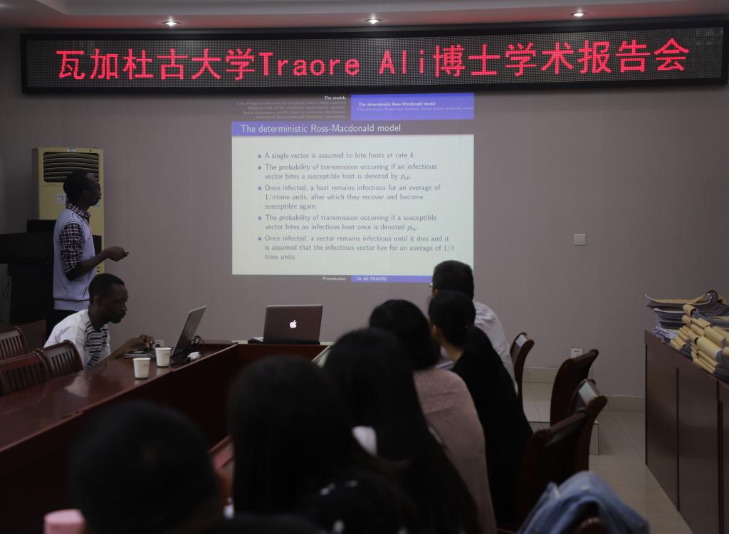 9月16日,应太阳成集团tyc234cc主页邀请,非洲布基纳法索瓦加杜古大学Traore Ali博士在太阳成集团tyc234cc主页学术报告厅作了题为“一类随机媒介传染病模型”的学术报告。报告由太阳成集团tyc234cc主页副经理蔡礼明教授主持,太阳成集团tyc234cc主页部分老师和研究生聆听了此次报告。