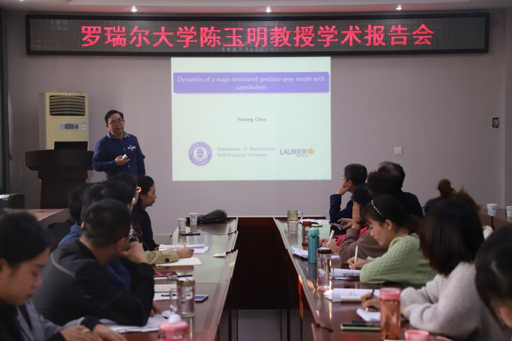 11月5日下午,应太阳成集团tyc234cc主页邀请,加拿大罗瑞尔大学陈玉明教授在太阳成集团tyc234cc主页学术报告厅作了题为“Dynamics of a stage-structured predator-prey model with cannibalism”的学术报告。报告会由太阳成集团tyc234cc主页副经理蔡礼明教授主持,生物数学团队全体教师和部分研究生聆听了此次报告。