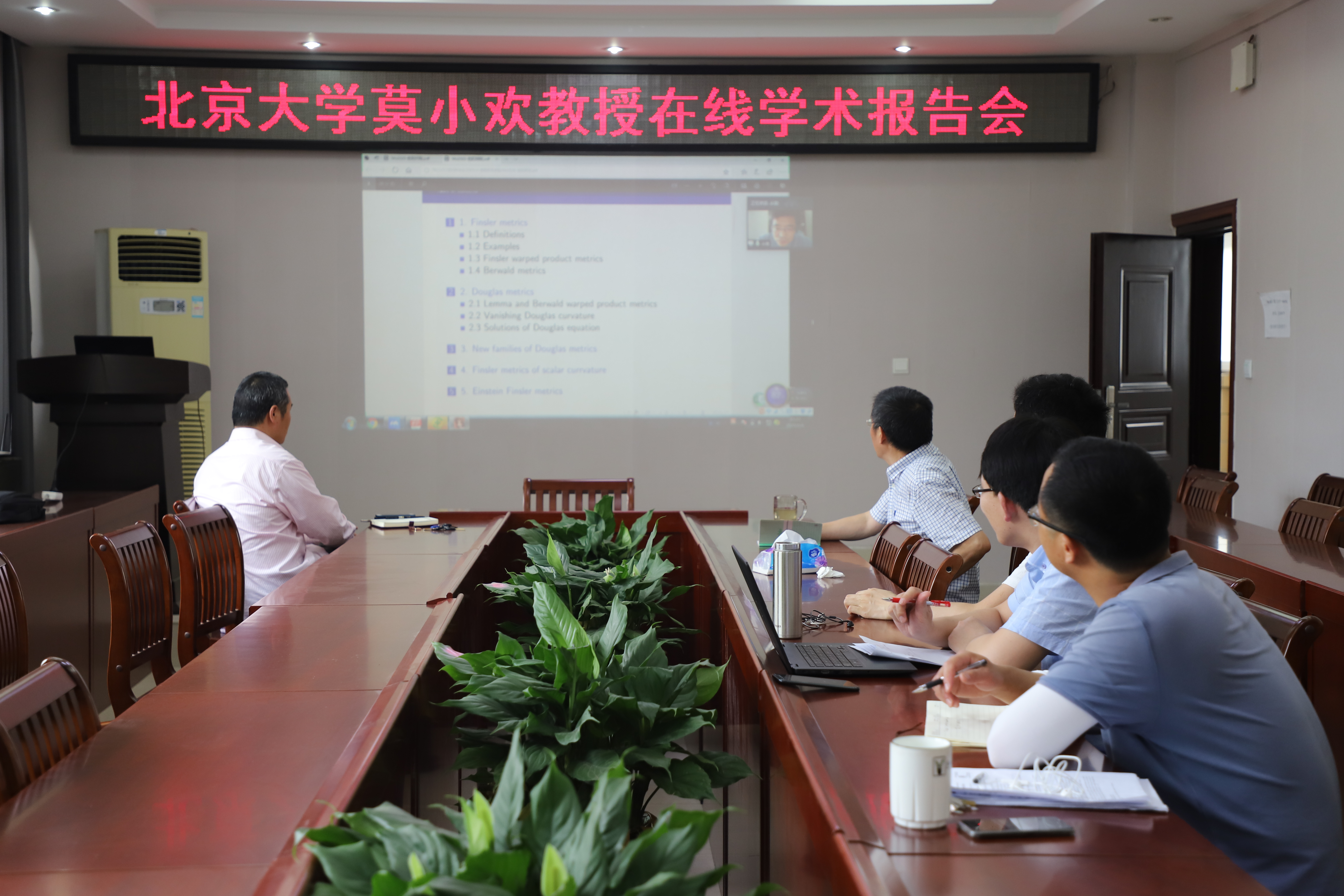 6月6日,北京大学莫小欢教授应太阳成集团tyc234cc主页邀请,通过腾讯会议平台为公司师生做了题为“Finsler warped product metrics”的学术报告。报告会由太阳成集团tyc234cc主页副经理蔡礼明教授主持,公司部分老师和研究生聆听了此次报告。