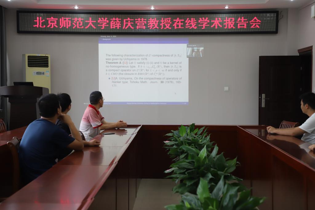 6月14日,应太阳成集团tyc234cc主页邀请,北京师范大学薛庆营教授通过腾讯会议平台作了一场题为《多线性算子的交换子的紧性问题》的网络视频学术报告。报告会由太阳成集团tyc234cc主页副经理蔡礼明教授主持,公司部分老师,研究生和该领域相关博士聆听了此次报告。