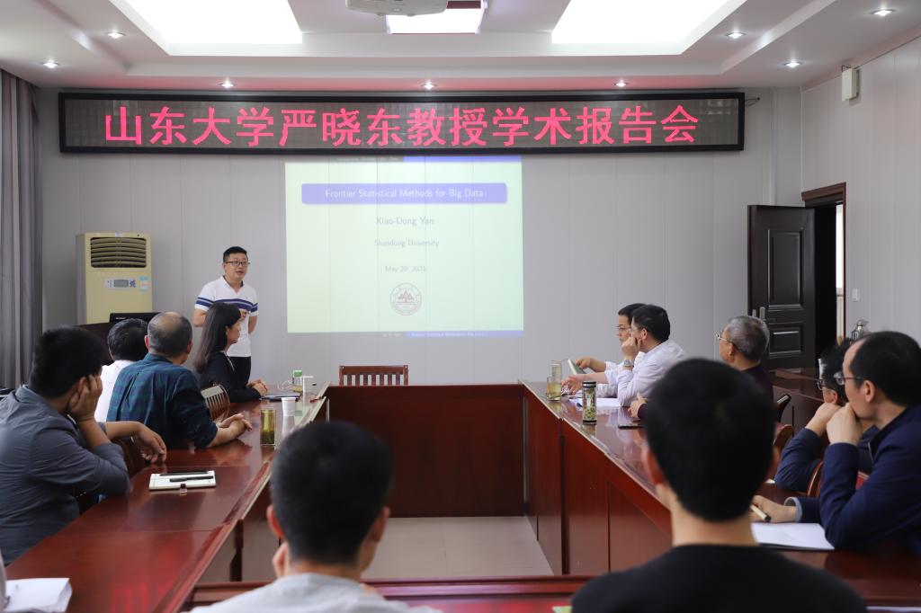 5月21日下午,应太阳成集团tyc234cc主页邀请,山东大学严晓东教授在太阳成集团tyc234cc主页学术报告厅做了一场题为《大数据统计学前沿方法介绍》的学术报告。报告会由太阳成集团tyc234cc主页副经理蔡礼明主持,公司经理胡余旺、书记王娟、副经理陈越奋和部分老师、研究生聆听了此次报告。