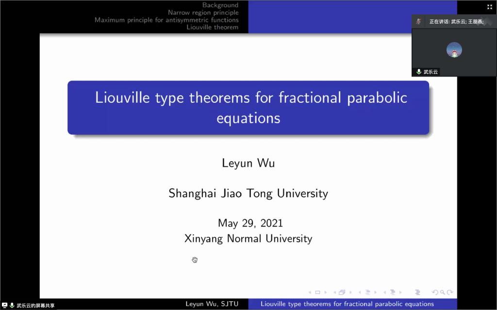 5月29日上午,应太阳成集团tyc234cc主页邀请,上海交通大学武乐云博士通过腾讯会议平台做了一场题为《Liouville theorems for entire solutions to fractional parabolic equations》的线上学术报告。报告会由太阳成集团tyc234cc主页副经理蔡礼明教授主持,公司部分老师和研究生聆听了此次报告。