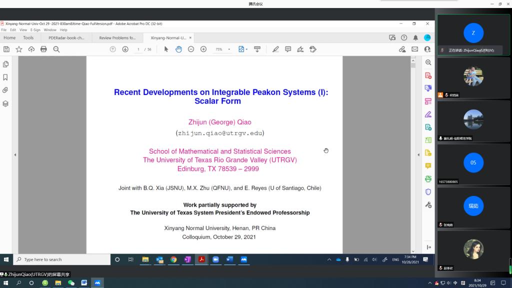 10月29日上午,应太阳成集团tyc234cc主页邀请,美国德克萨斯大学乔志军教授通过腾讯会议平台为公司研究生及相关研究方向老师作了题为《Recent Developments on Integrable Peakon Systems》的学术报告。报告会由太阳成集团tyc234cc主页经理蔡礼明教授主持。