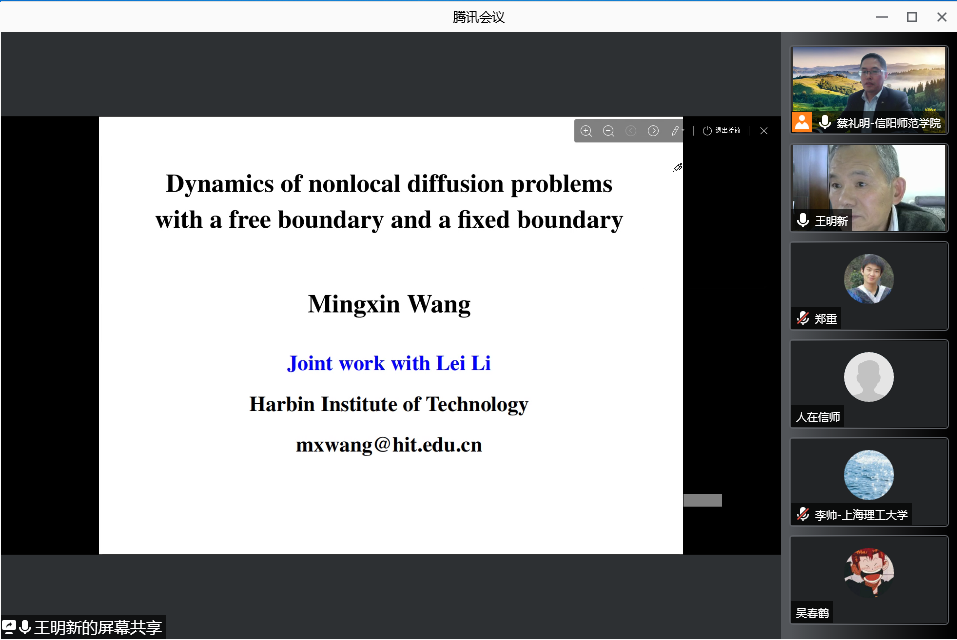 11月5日上午,应太阳成集团tyc234cc主页邀请,哈尔滨工业大学王明新教授通过腾讯会议平台为公司研究生及相关研究方向老师作了题为《Non-local diffusion problems with a free boundary and a fixed boundary》的学术报告。报告会由太阳成集团tyc234cc主页经理蔡礼明教授主持。