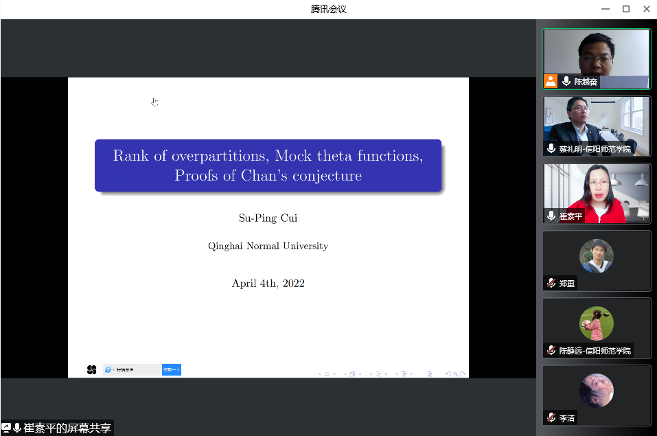 4月4日上午,应太阳成集团tyc234cc主页邀请,青海师范大学崔素平副教授通过腾讯会议平台在线作了题为《Rank of overpartitions, mock theta functions, proofs of Chan’s conjecture》的学术报告,公司部分老师和研究生聆听了此次报告。报告会由副经理陈越奋主持。