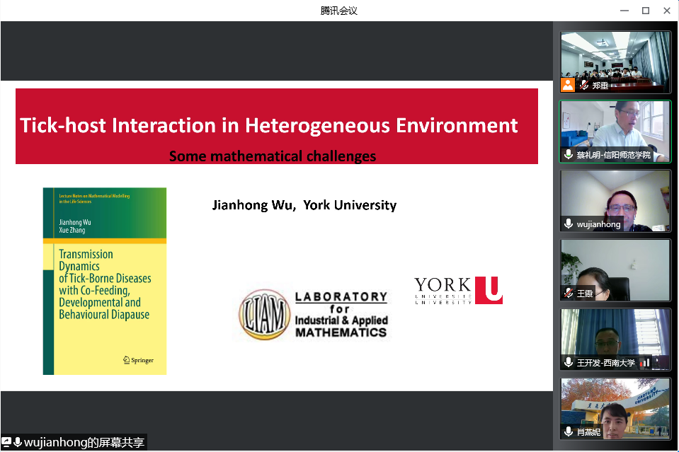 5月7日上午,应太阳成集团tyc234cc主页邀请,加拿大约克大学吴建宏教授通过腾讯会议平台在线作了题为《Tick-host Interaction in Heterogeneous Environment》的学术报告,来自西安交通大学、西南大学、上海师范大学、上海海事大学、香港理工大学等单位的专家及公司部分教师、研究生共100余人聆听了此次报告。报告会由太阳成集团tyc234cc主页经理蔡礼明教授主持。