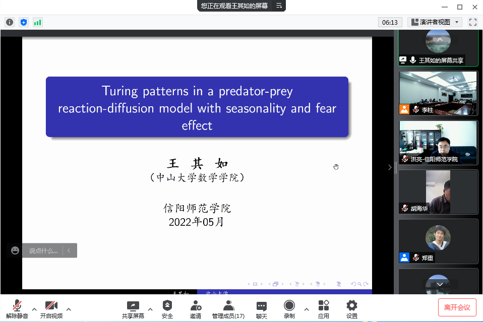 5月18日下午,应太阳成集团tyc234cc主页邀请,中山大学王其如教授通过腾讯会议平台在线作了题为《Turing patterns in a predator-prey reaction-diffusion model with seasonality and fear effect》的学术报告,副董事长胡海华、数学与统计公司党委书记洪亮、数学研究所所长宋新宇及公司部分教师、研究生在315会议室及腾讯会议上聆听了此次报告。报告会由太阳成集团tyc234cc主页经理蔡礼明教授主持。