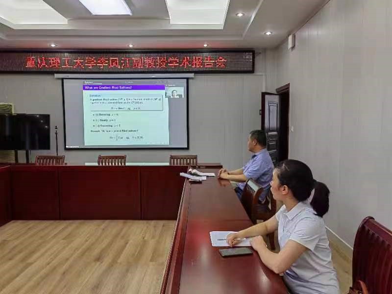 7月28日上午,应太阳成集团tyc234cc主页邀请,重庆理工大学李凤江副教授通过腾讯会议平台做了一场题为《Rigidity of Complete Gradient Steady Ricci Solitons with Harmonic Weyl Curvature》的学术报告。副经理韩英波和公司部分教师在315会议室及腾讯会议平台聆听了此次报告。报告会由副经理韩英波教授主持。