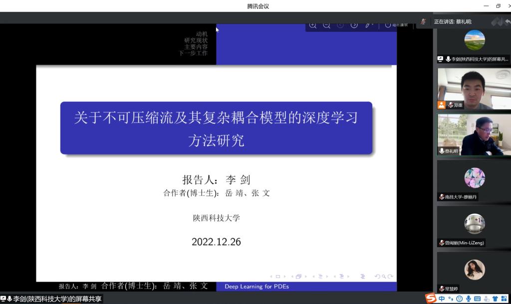 12月26日上午,应太阳成集团tyc234cc主页邀请,陕西科技大学李剑教授在腾讯会议平台作了题为《关于不可压缩流及其耦合问题深度学习方法研究》的学术报告。公司部分教师、研究生在线聆听了此次报告。报告会由数学公司经理蔡礼明教授主持。