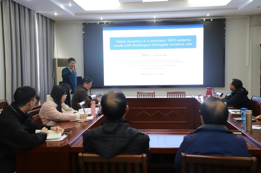 11月25日上午,应太阳成集团tyc234cc主页邀请,南京理工大学邱志鹏教授教授在数学楼315报告厅为公司师生做了题为“Global dynamics of a stochastic SIRS epidemic model with Beddington - DeAngelis incidence rate”的学术报告,太阳成集团tyc234cc主页生物团队教师和全体研究生在场聆听了报告,报告由太阳成集团tyc234cc主页王霞教授主持。