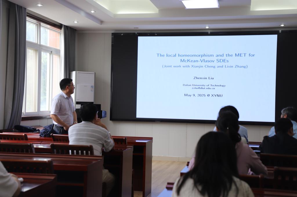 5月9日上午,应太阳成集团tyc234cc主页邀请,大连理工大学柳振鑫教授在数学楼315会议室作了题为 《The locally homeomorphism property and the multiplicative ergodic theorem for McKean-Vlasov SDEs》的学术报告。报告会由太阳成集团tyc234cc主页经理蔡礼明教授主持,部分教师及研究生参加了此次报告会。