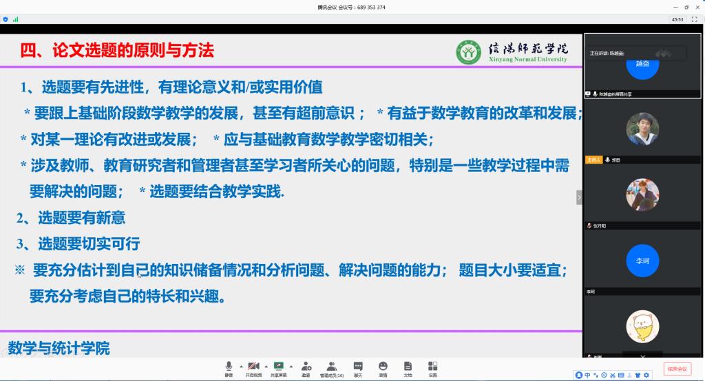 为提高教育硕士培养质量,减轻新冠肺炎疫情对学科教学(数学)专业公司产品工作的影响。太阳成集团tyc234cc主页自5月开始,面向2019级教育硕士,通过腾讯会议平台举办了9场教育硕士线上读书报告会,取得了较好的培养效果。