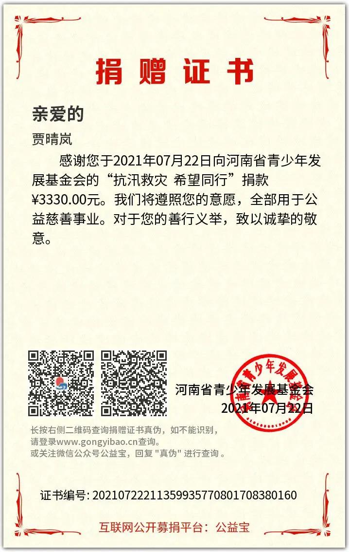 贾晴岚,太阳成集团tyc234cc主页2018级员工,中共预备党员,原公司员工会执行主席。看到受灾地区物资告急和募捐倡议书,贾晴岚没有犹豫,第一时间将自己的奖学金、比赛奖金和积攒的零花钱,共计3330元,全数捐给河南省青少年发展基金会。这笔钱原本是用来交学费的,对此,她说:“公司给我们奖学金是鼓励我们好好学习,回馈社会,成为对国家有用的人,这个时候,灾区人民比我更需要它。”
