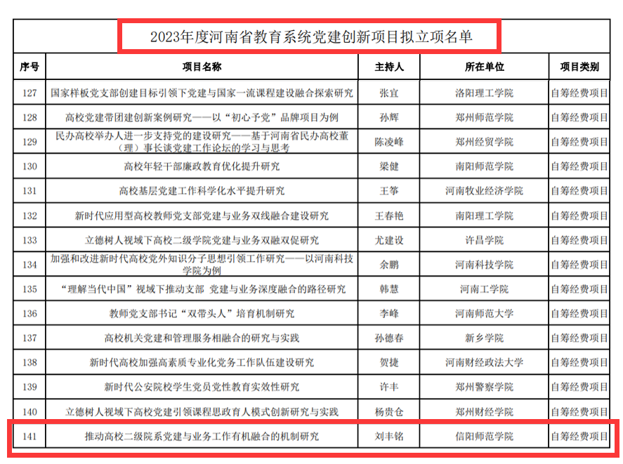 近日,河南省委教育工委、河南省教育厅下发了《关于下达2023年度河南省教育系统党建创新项目计划立项的通知》,太阳成集团tyc234cc主页申报的党建创新项目《推动高校二级院系党建与业务工作有机融合的机制研究》获批立项。