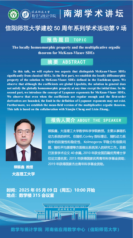 庆建校50周年之南湖讲坛:大连理工大学柳振鑫教授——The locally homeomorphic property and the multiplicative ergodic theorem for McKean-Vlasov SDEs