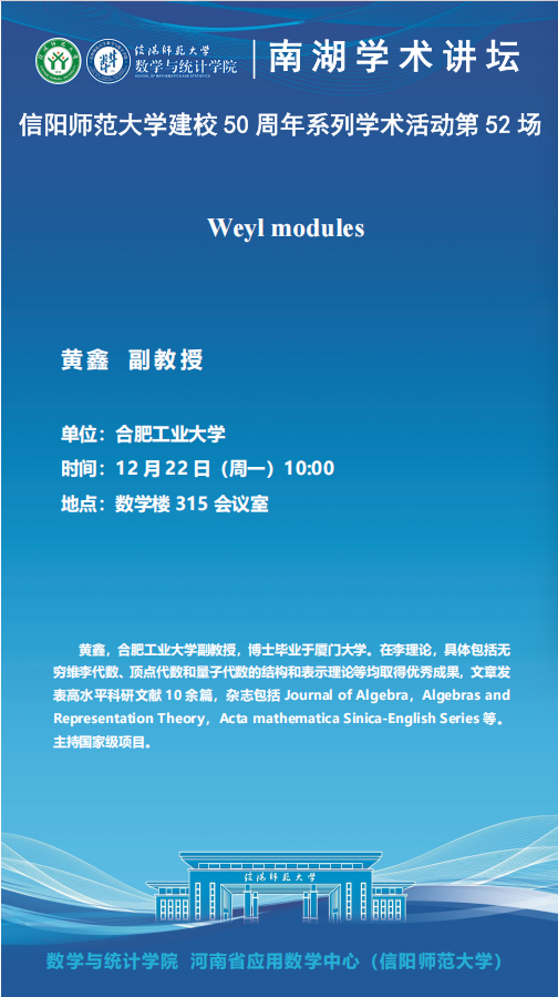 庆建校50周年之南湖讲坛:合肥工业大学黄鑫副教授——Weyl modules